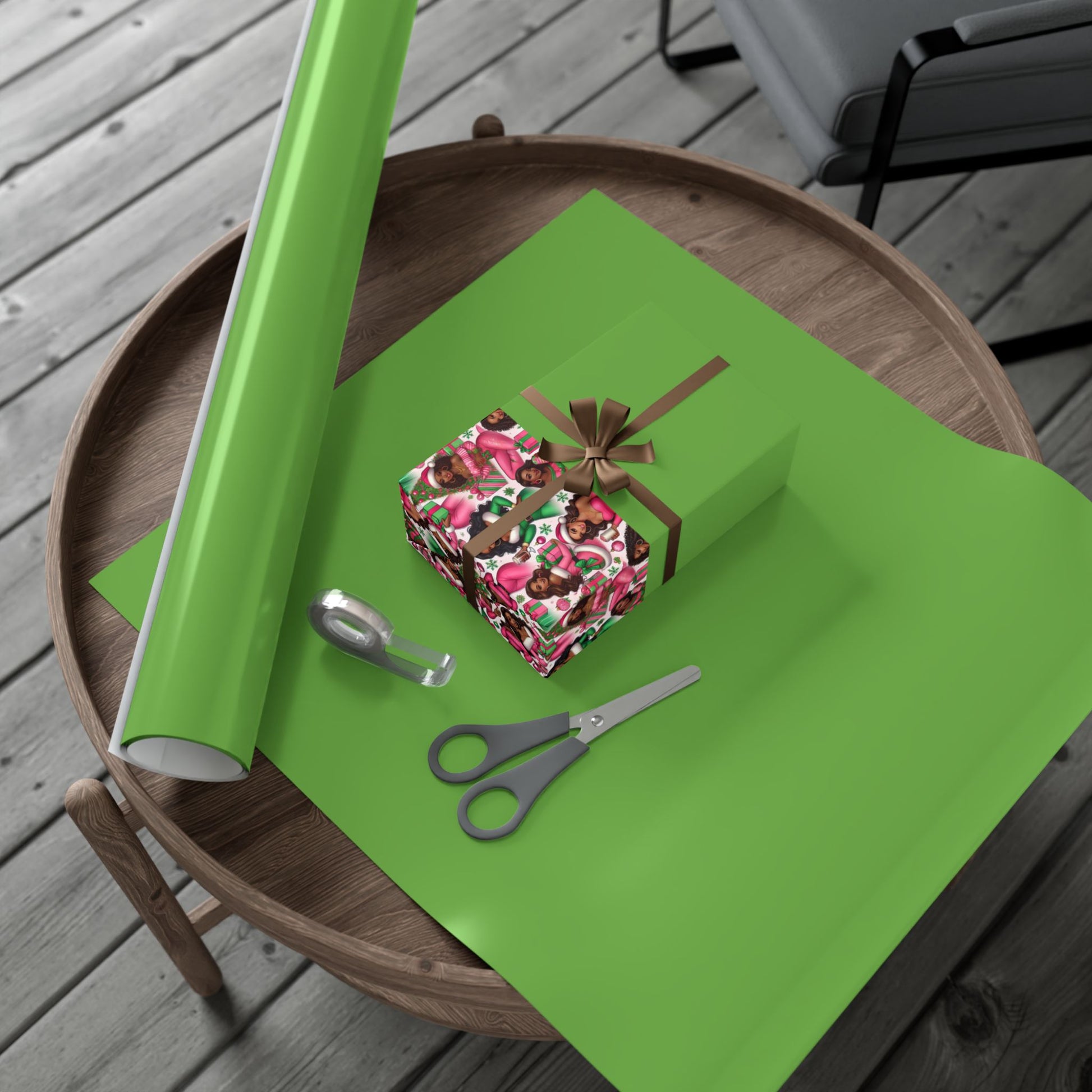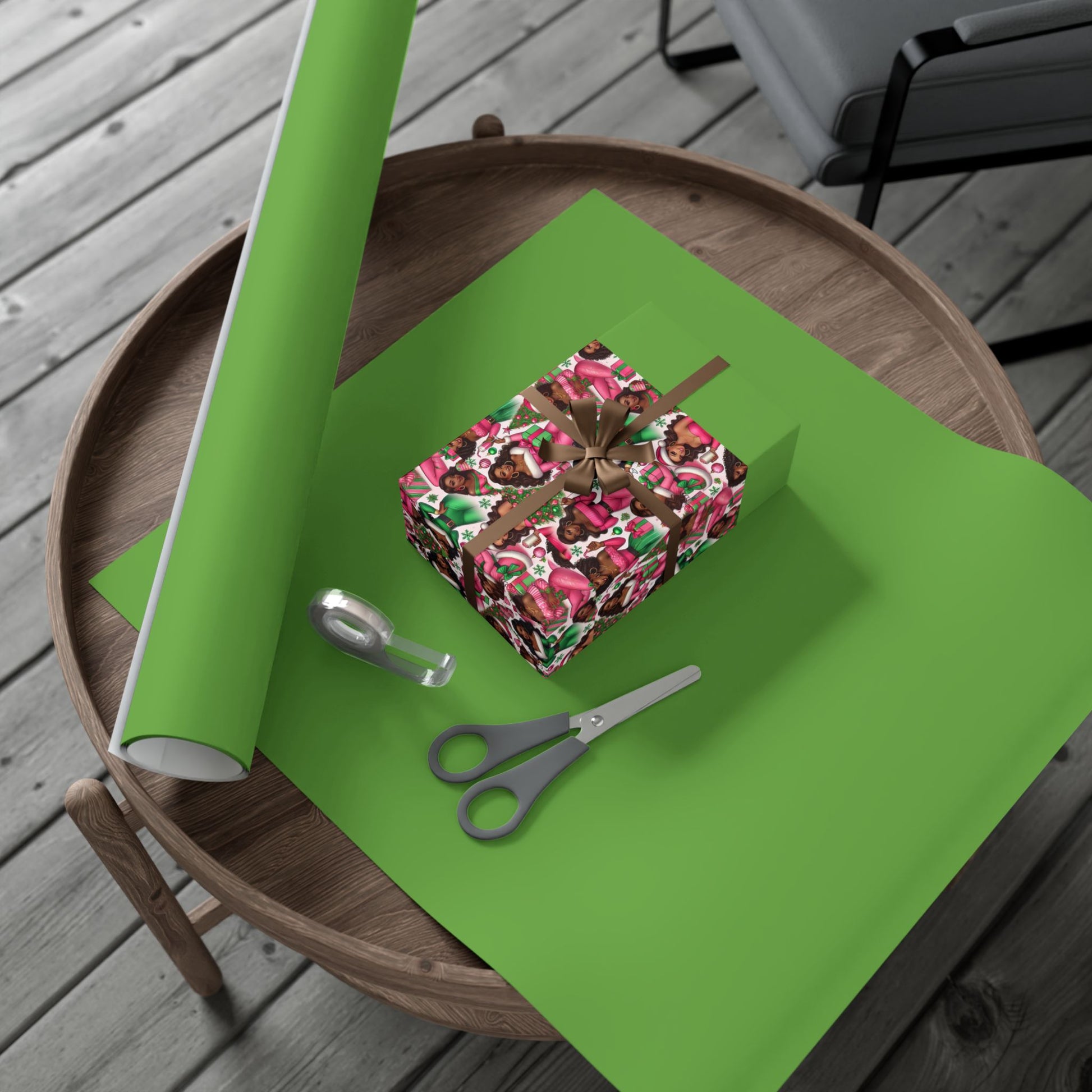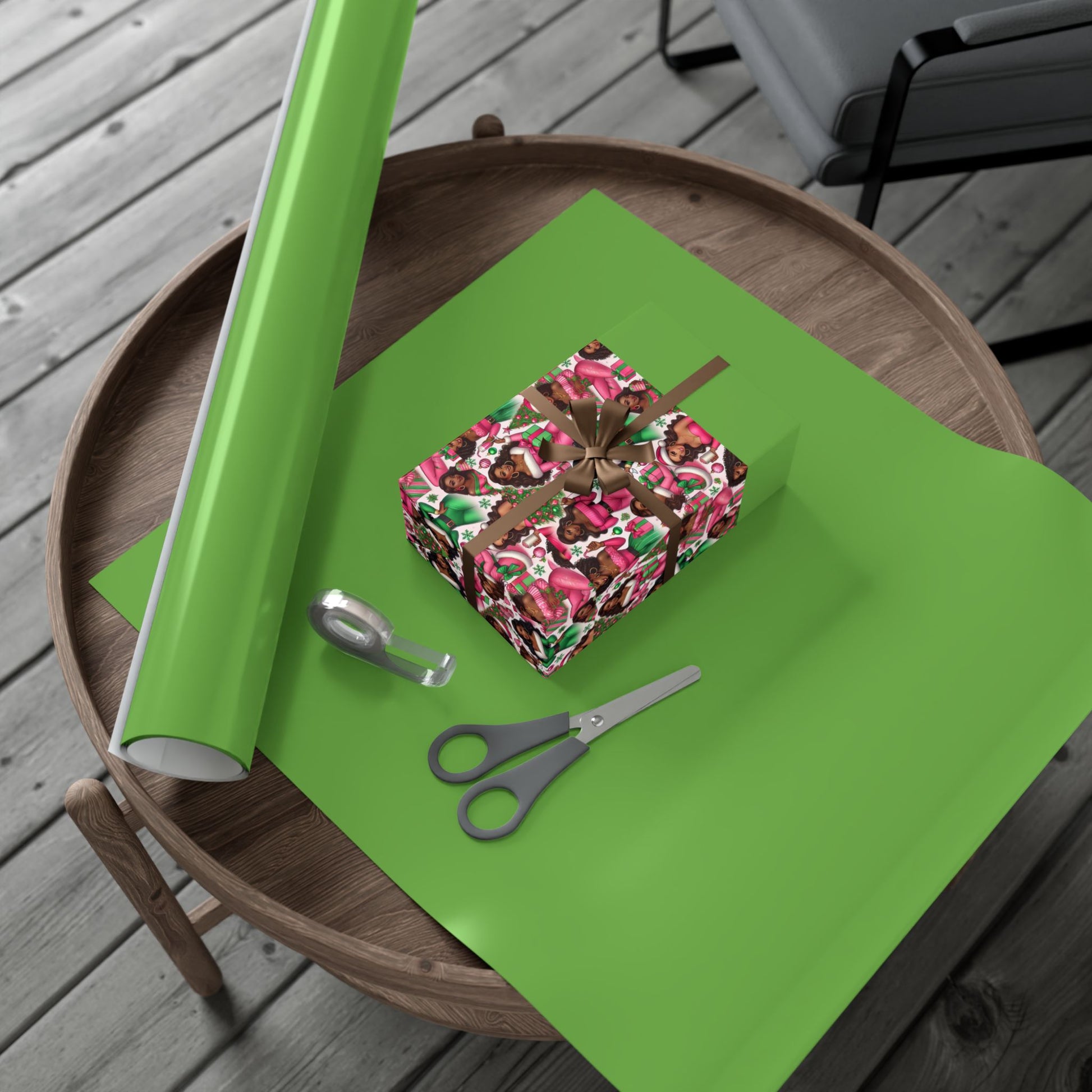 This cheerful gift wrap brings festive warmth to every present. The sheet features a repeating pattern of joyful figures in pink and green, creating a lively, modern holiday vibe that brightens any unwrapping moment. Choose satin for a luminous sheen or matte for a refined, contemporary look. The paper feels sturdy and flexible — it folds crisply without cracking and resists scratches or light moisture during handling. Printed with water-based GreenGuard UL certified inks, the colors stay vivid and clean while keeping environmental impact low. Available in three sizes to suit small trinkets or larger boxes, these recyclable wrapping sheets are assembled in the USA from globally sourced materials and work beautifully when paired with simple twine, metallic ribbon, or kraft tags to match the mood of your celebration.
